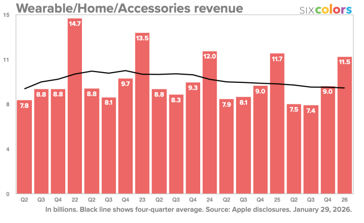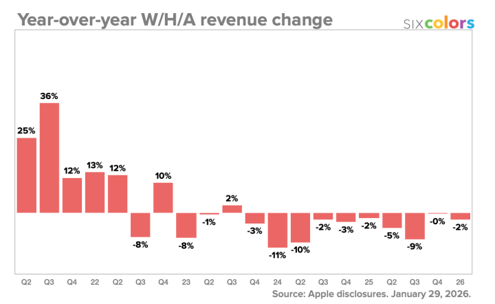 财报数据显示,“可穿戴、家居及配件”业务类别(涵盖AirPods、AppleWatch及HomePod等产品)在这一季度营收同比下滑了约2%。IT之家附上相关图表数据如下: